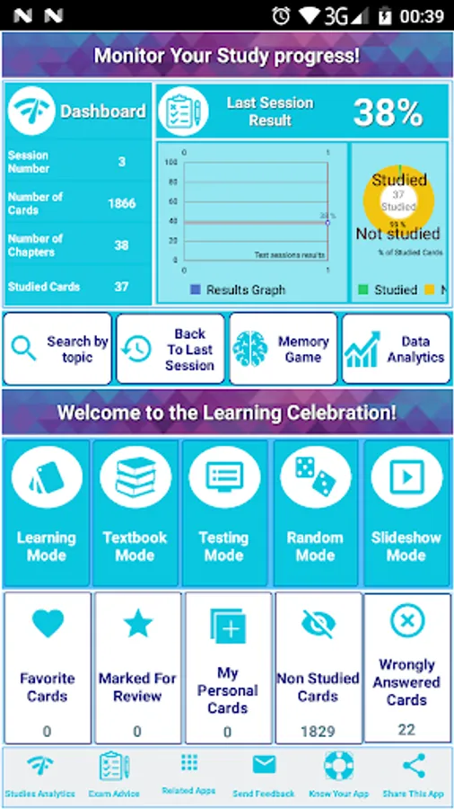 - Six study Modes (learning mode, handout mode, test mode with MCQs, slideshow mode, random mode & Game Memory mode) .