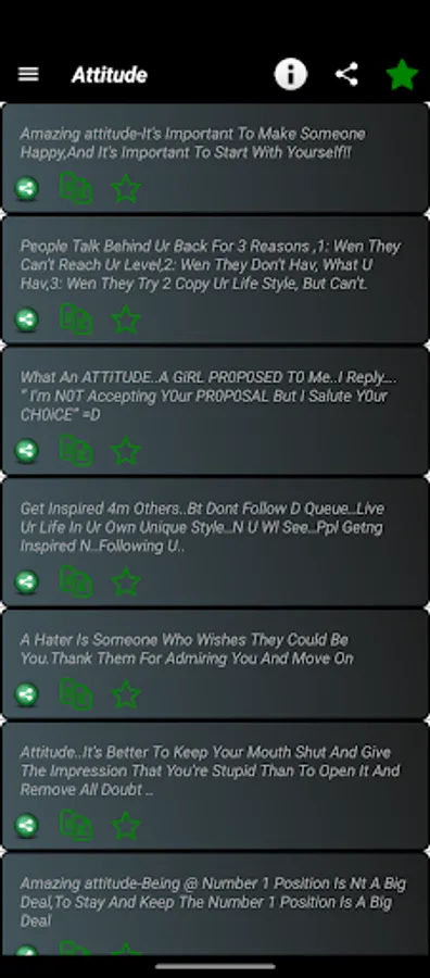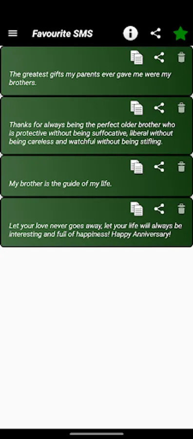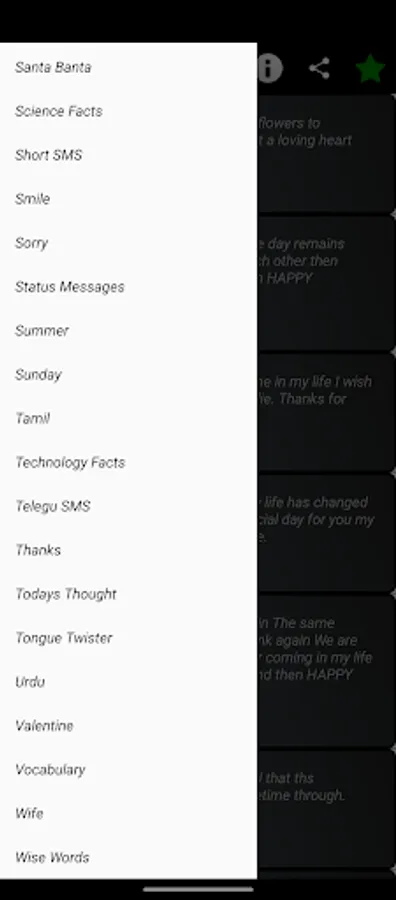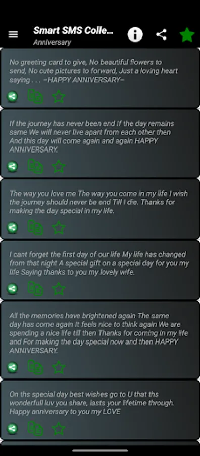 This application is easy to handle and a quikie too. You just select the category then a list of SMS falls on your phone screen select your sms, tap on it and you will get the options to share it.