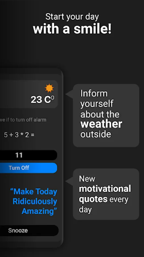 You don't need a guide for self-improvement, because now you have “Easy Wake Up! Super Smart Alarm Clock” with motivational quotes that will make your mornings brighter and more positive. With an optimistic way of thinking from the early morning, you can be sure that the rest of your day will be great. A positive attitude will lead you to success. So, no matter of your sleep cycle, you will always wake up with a smile on your face. Prepare your brain for work, shake it up with some math problems that will make you awake faster than the strongest coffee in the world.