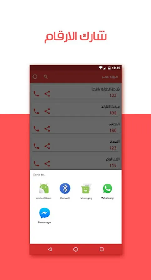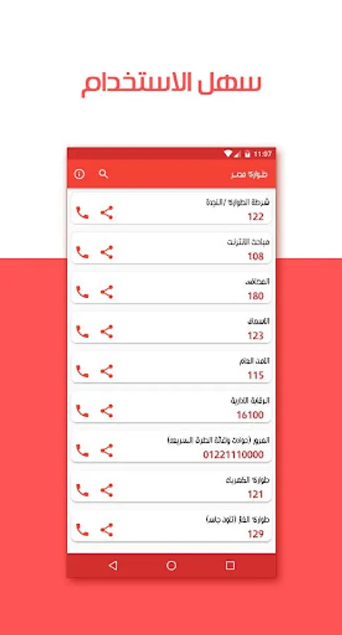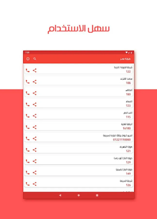Simple application is estimated through looking and relate to figures of emergency in Egypt, for example, public security, administrative control, human rights, complaints of the Council of Ministers, admonishing online, for help, police, Traffic, Fire Station, gas emergency, electricity emergency, emergency water, sanitation emergency , Tourism police, military police, emergency Ministry of Health, Dar Mufti, military intelligence, Cairo airport and other important figures in Egypt.