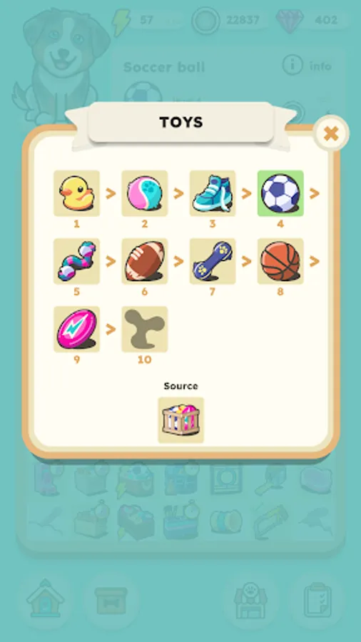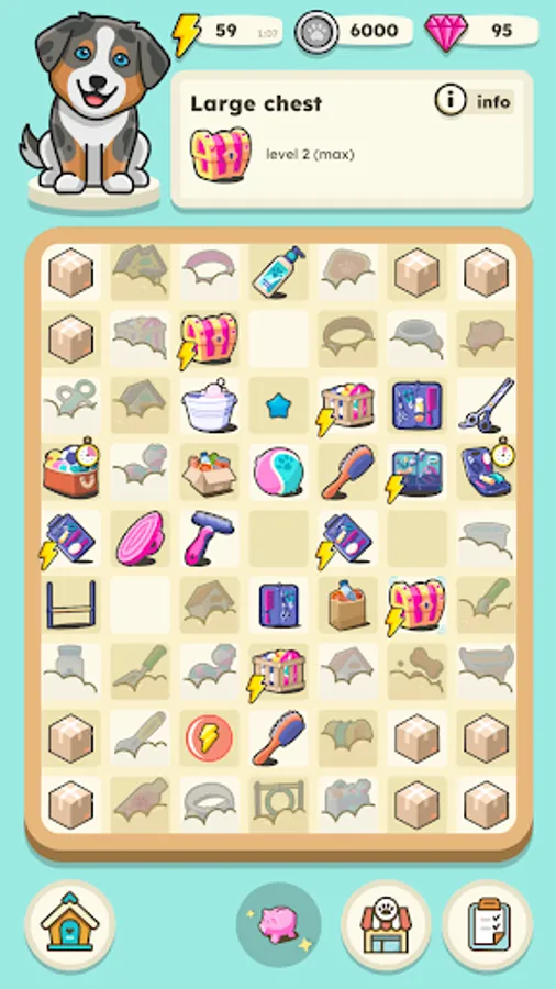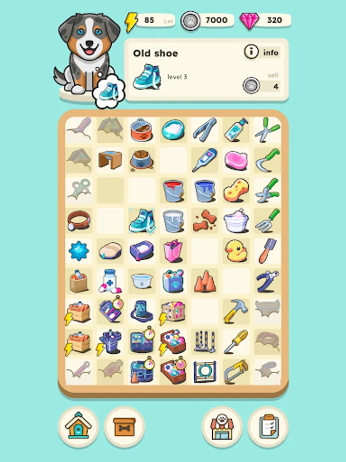 Merge toys, dog houses, pillows, medicine, grooming tools, bathing supplies, snacks, food, training equipment, to keep your puppy happy and balanced. It's like Tamagotchi, except so much better. Your puppy needs different combinations of items at different times and you mix and merge them together on a beautiful board.