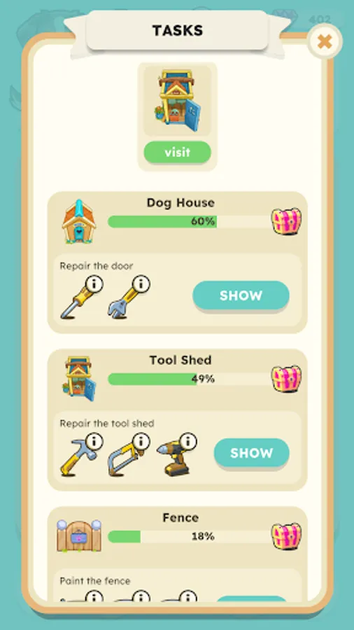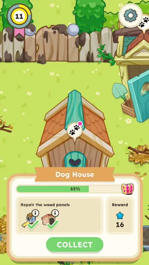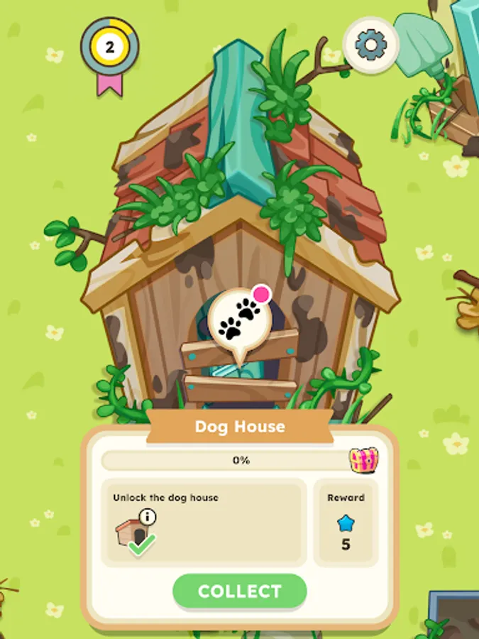 Unlock Puppy Town, where you find your home and look after the neighborhood. Restore your dog house, clean up the yard and get access to new features and functionality.