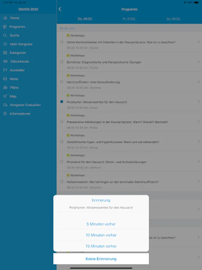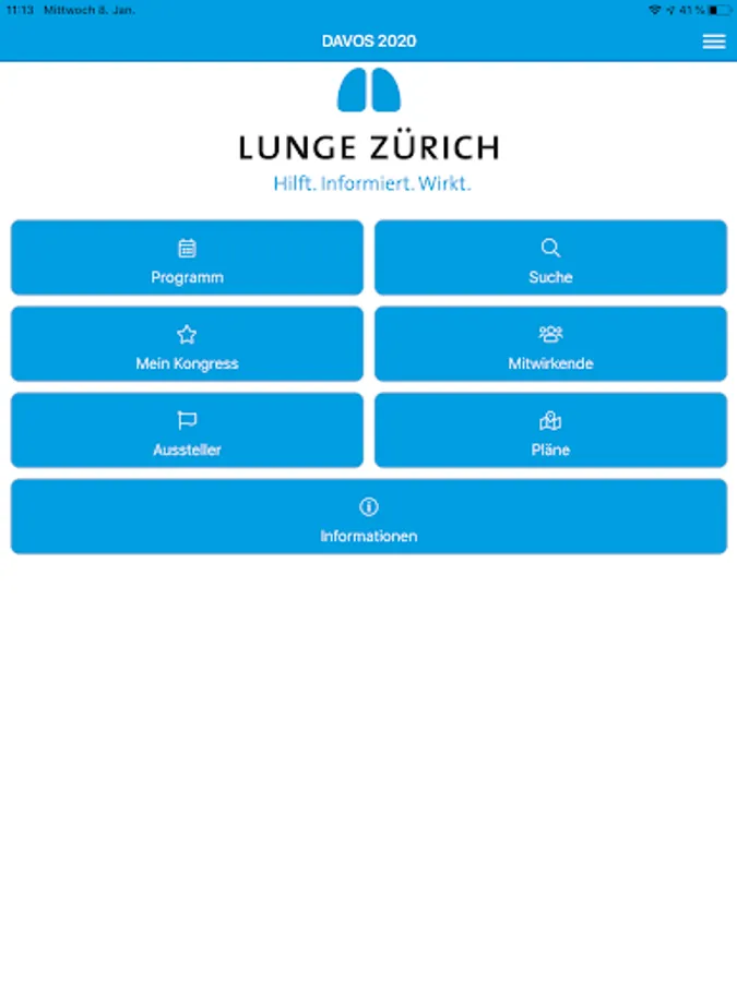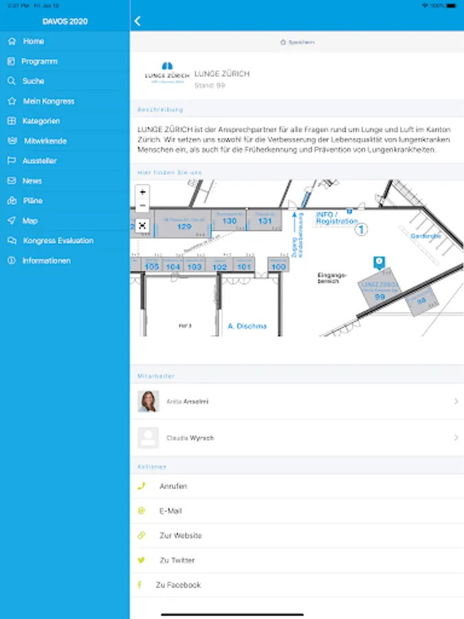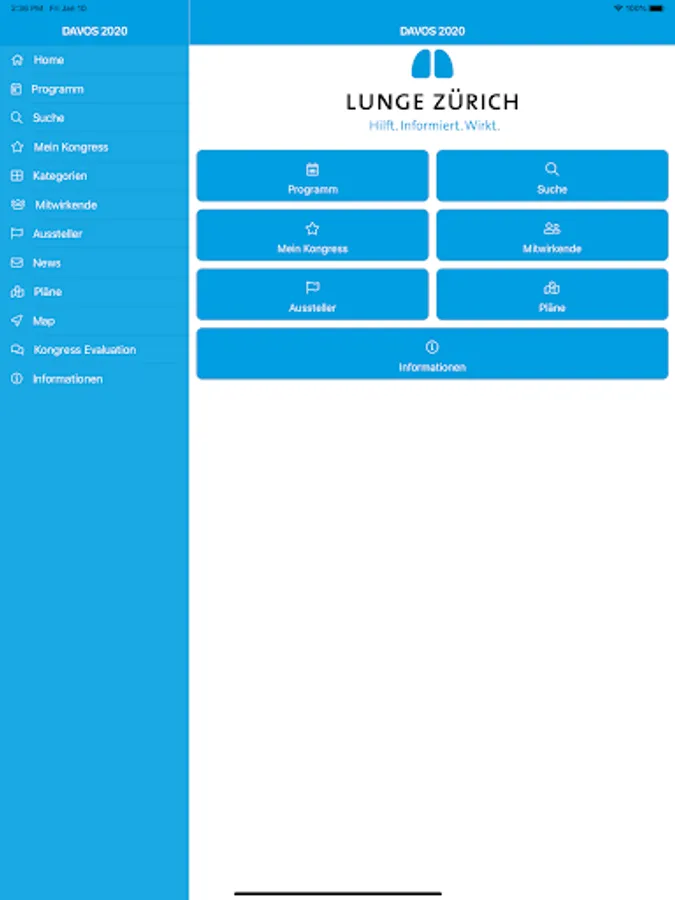 The DAVOS 2020 app is the ideal companion for all participants in the 59th Medical Congress from February 6 to 8, 2020 in Davos. Browse workshops, specialty courses and main lectures, take notes of the courses you attended and save your favorites. The app gives you a quick overview of all the events of the day. You can call up the course and workshop schedule, the list of speakers and exhibitors, as well as maps of the premises and the exhibitor stands with just one click. Changes are automatically transferred to your phone or tablet. So you always have the current congress program and much more with you. The app is now also used to assess the various occasions. You can fill in the evaluations with your smartphone, tablet or notebook. Do you have any questions about the application, the installation or the new evaluation? During the medical congress, please contact the LUNGE ZÜRICH booth at the main entrance.