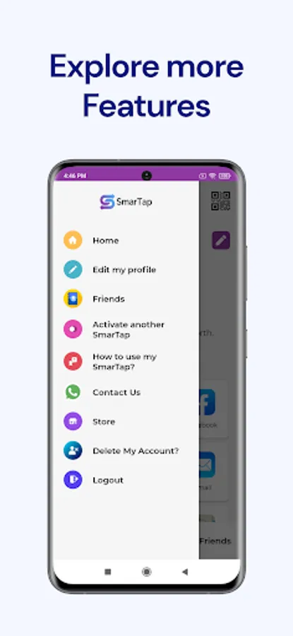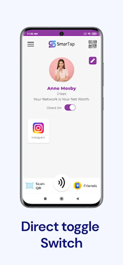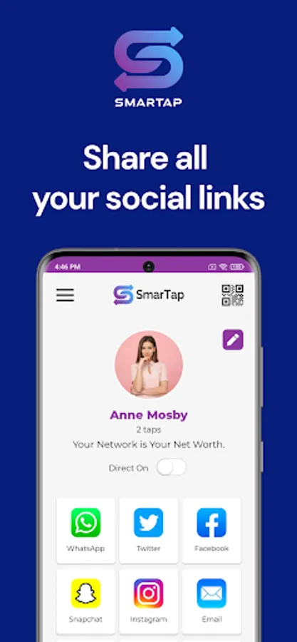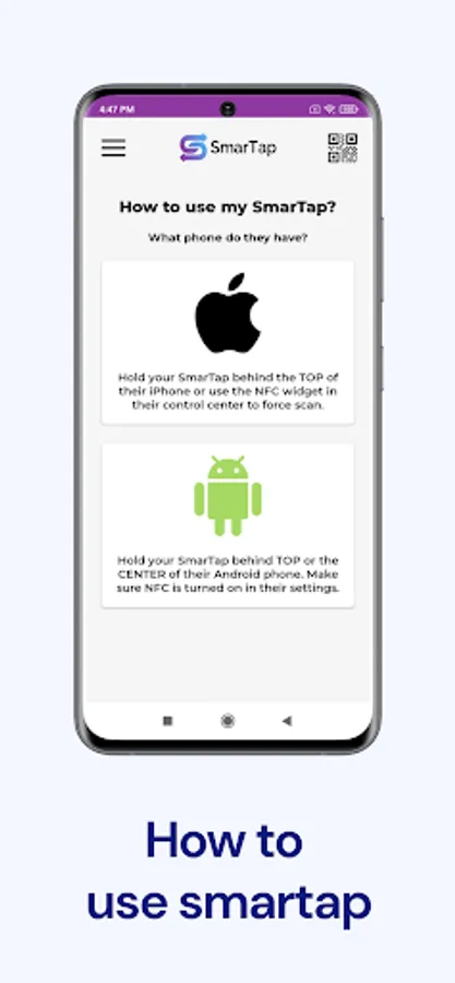 To share a profile simply tap the NFC tag to a phone having NFC or let anyone scan your in-app QR code. Make sure Android phones have NFC turned on in settings. Others won't need the app or a SmarTap to receive your information.
