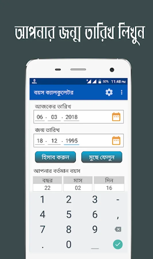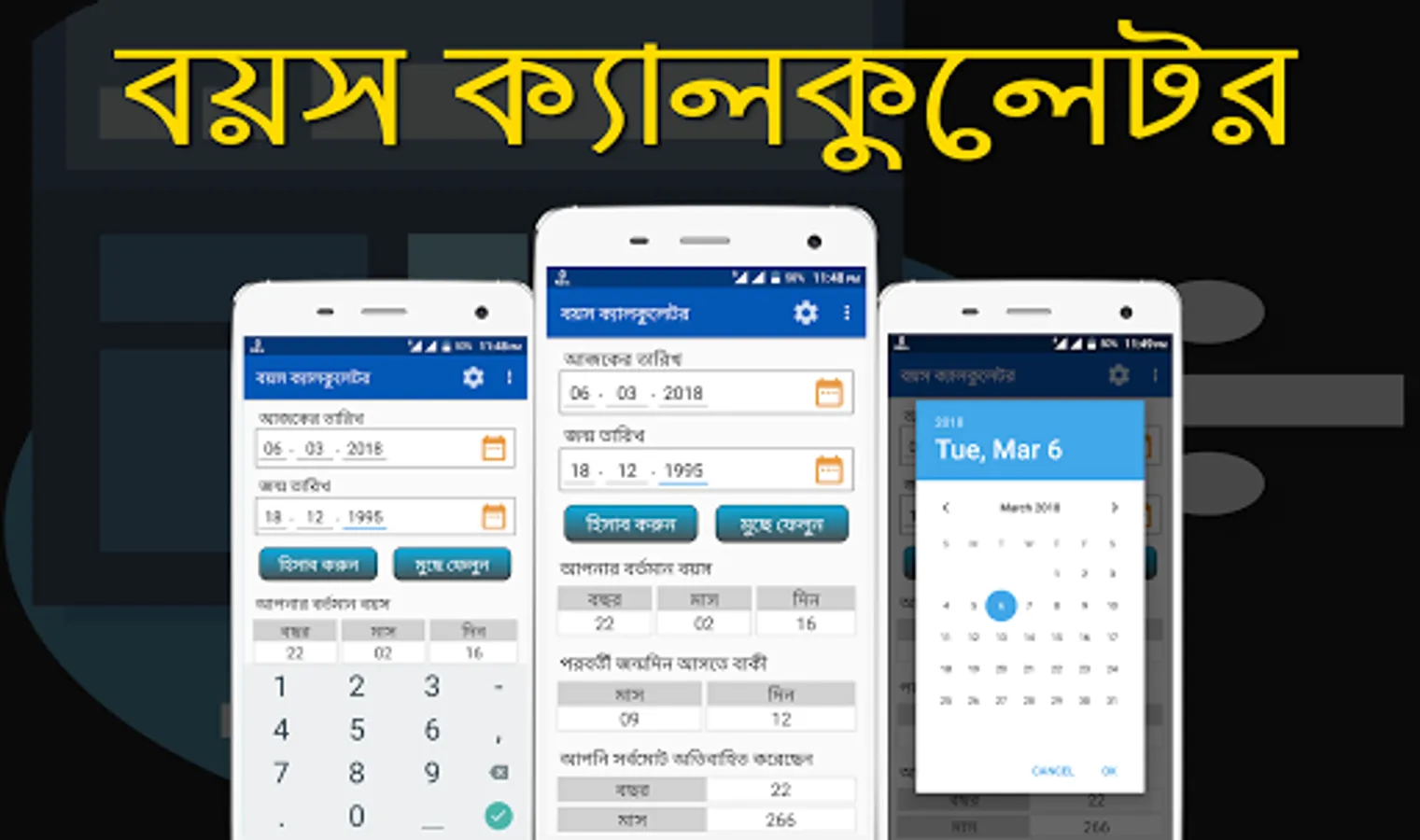 সঠিক ও নিখুত বয়স বের করা আমাদের অনেকেরই প্রয়োজন। কখনও কখনও আমরা আমাদের আসন্ন জন্মদিন কখন, কত তারিখ, কি বার জানতে আগ্রহী হই। সঠিক ভাবে বয়স বের করতে অর্থাৎ calculate করতে আমাদের অনেক কষ্ট পোহাতে হয়। দেখা যায় অনেক সময়ই ক্যালকুলেটর সামনে থাকে না। ক্যালকুলেটরে যে সহজে হিসাব করবেন তারও কোন সঠিক নির্দেশনা নেই। তাই সল্প সময়ে ও সঠিক ভাবে birthday calculate করতে আমরা আপনাদের জন্য নিয়ে এসেছি Age Calculator ।এই অ্যাপের মাধ্যমে আপনি আপনার বয়স নিখুত ভাবে ক্যালকুলেশন করতে পারবেন এবং পরবর্তী জন্মদিন দেখতে পারবেন।