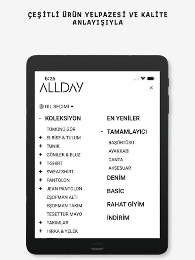 Closely following the season trends, Allday, with its innovative perspective, original designs, diversity and quality understanding in its product range, is the industry's leading hijab and clothing in the categories of hijab wear, maternity wear, tunic, hijab evening dresses, oversized products, sweat suits and accessories. is rapidly progressing towards becoming a brand.