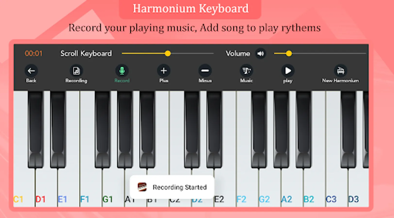 => Zoom In / Zoom Out Keys - Use the Plus / Minus buttons for Zoom In / Zoom Out the keys of the harmonium and adjust them according to your needs.