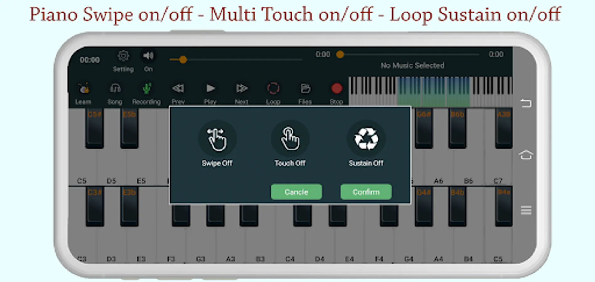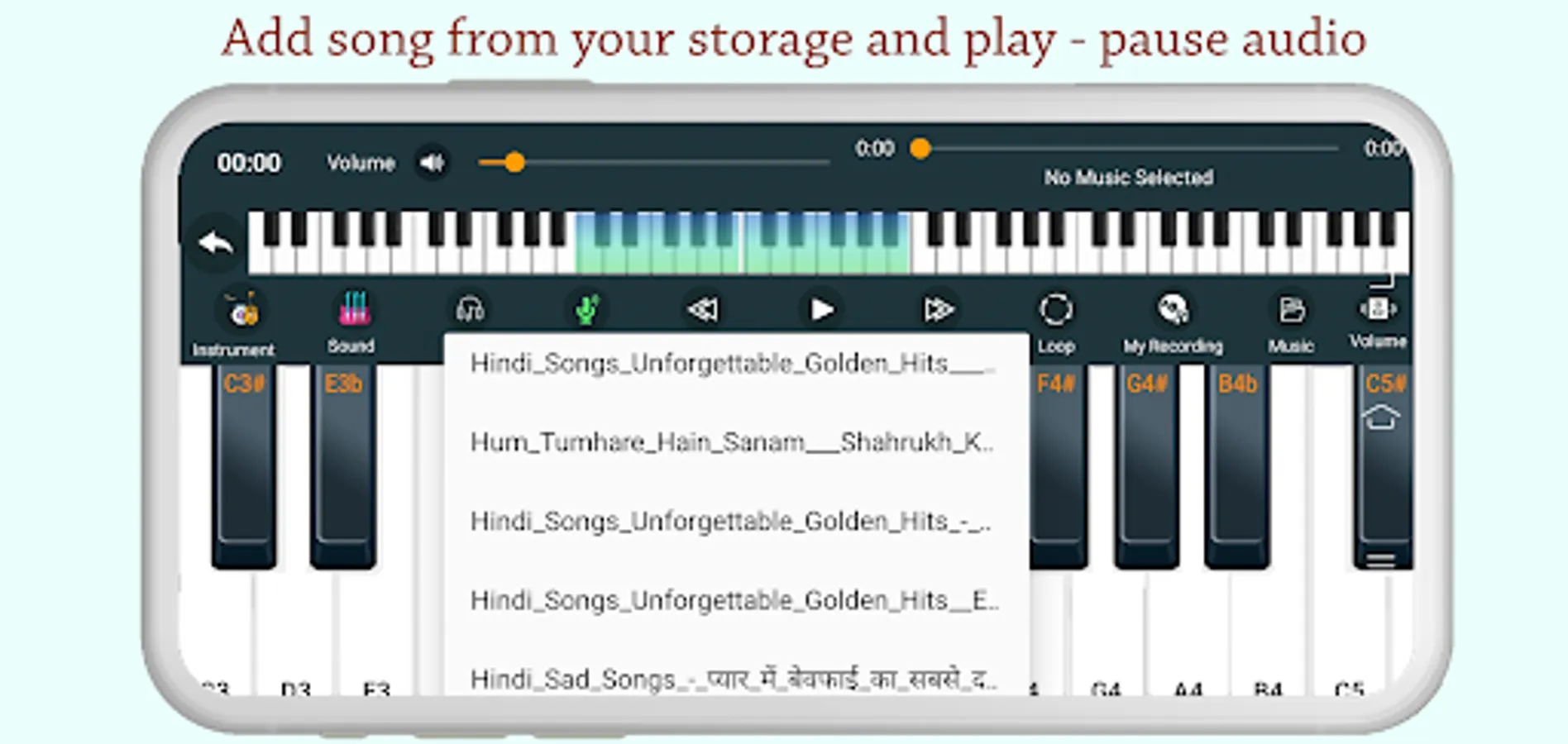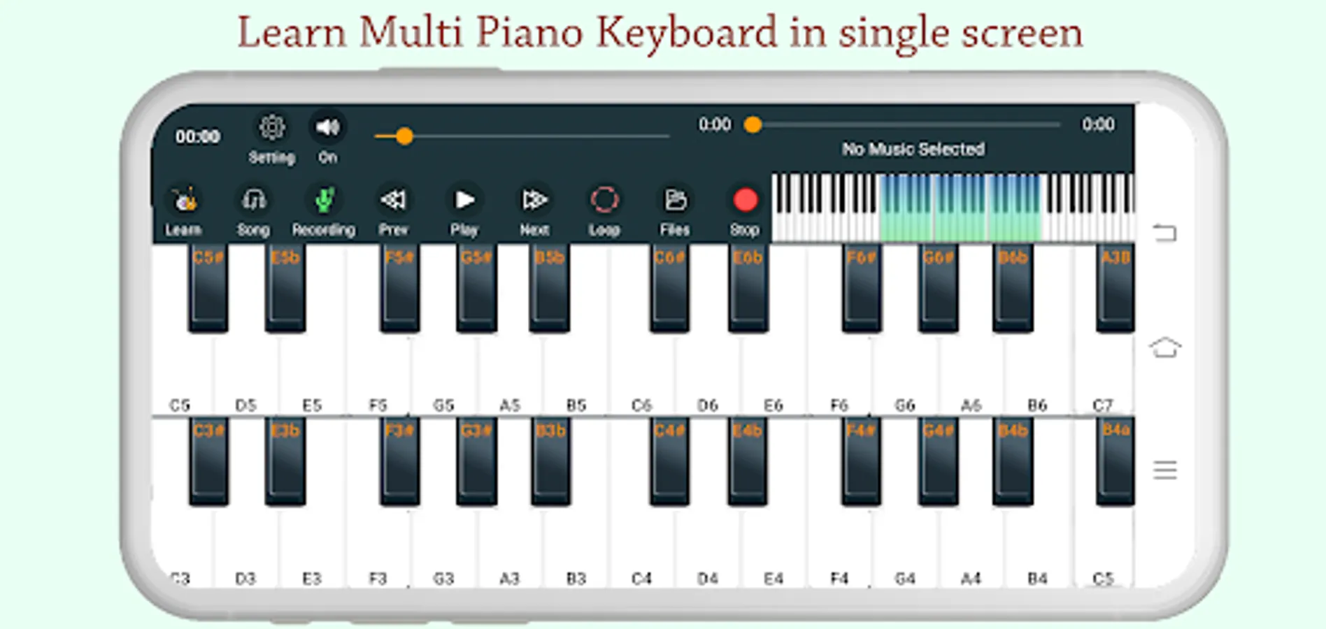 Piano Music: Learn Piano App has many built in Piano Songs to autoplay while learning Piano and Recording Piano Tunes.
