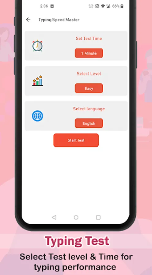 4. Typing Test : In Typing Master app Test timing options are one/two/five/ten minutes or you can set custom timing. The test will start after you type the first character of the paragraph shown. Use the typing master app and challenge your friend for a typing test game with the best Typing Speed Test app.