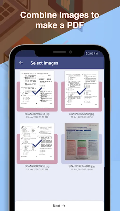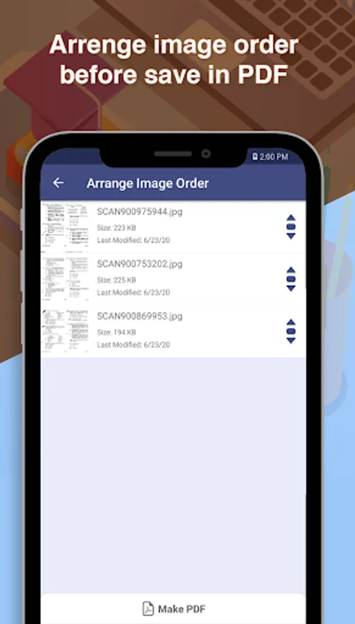 Document Scanner allows you to make PDF files form your scanned images. It also has rearrange image option to re-order images as your needs.