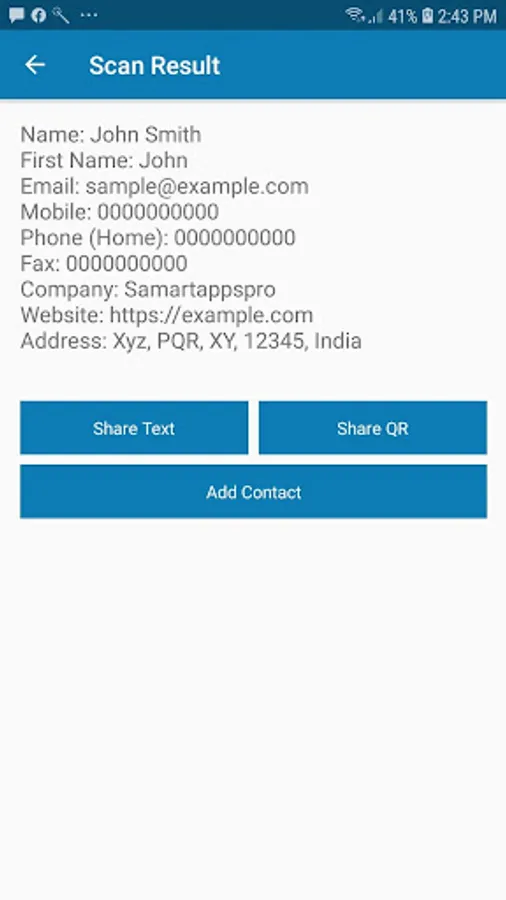 - Call/SMS/Open Geo Location, Map, Add Contact etc actions available based on QR code