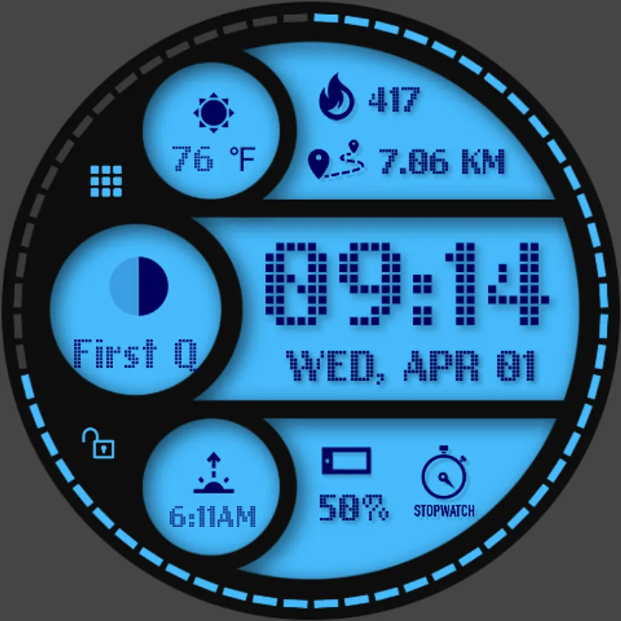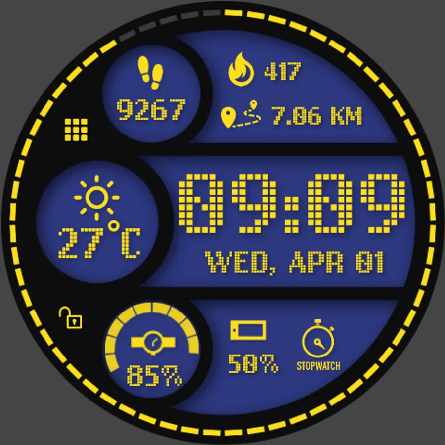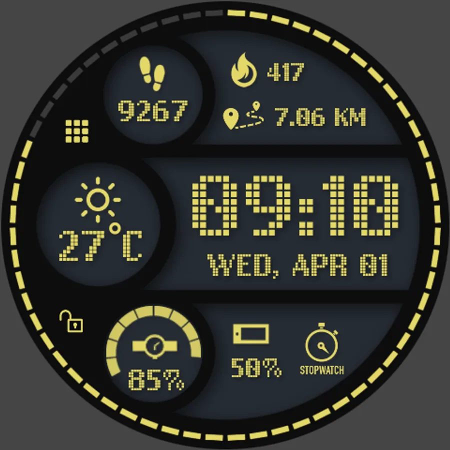 The watch face has 3 interactive tap targets on Watch face , which are fully customizable to be more informative which include number of data such as Weather, Steps, Battery level ,Date, etc..
