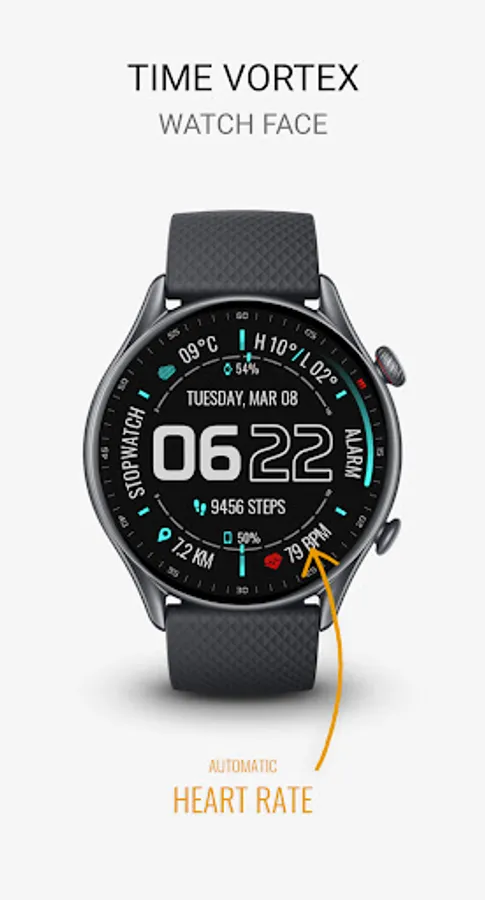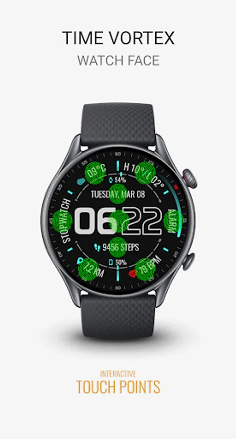 The watch face has many interactive tap features , which are fully customizable to be more informative which include number of data such as Auto Heart Rate, Weather, Steps data, Stopwatch, App Shortcuts, Every Hour Beep Sound, etc..