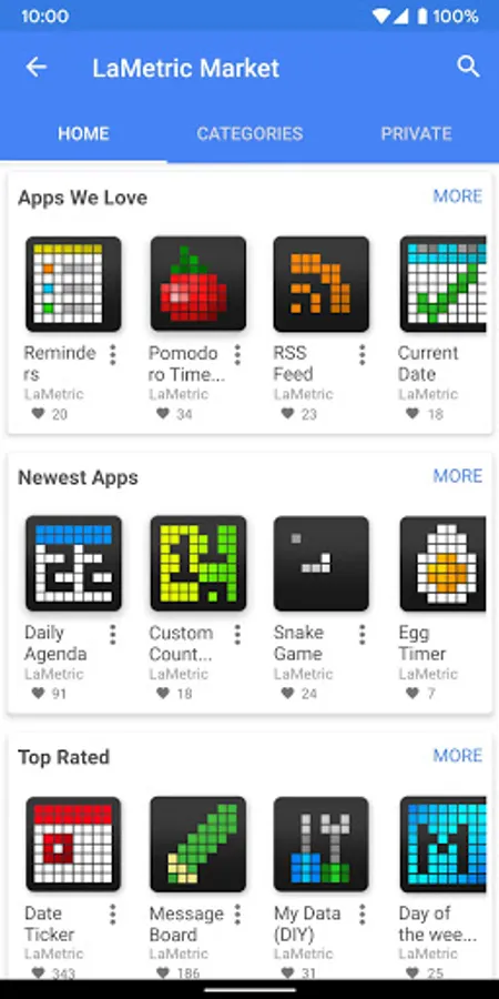 • Discover new and popular apps by category: For everyone, For Business, Private (created for own purposes at LaMetric Developer)