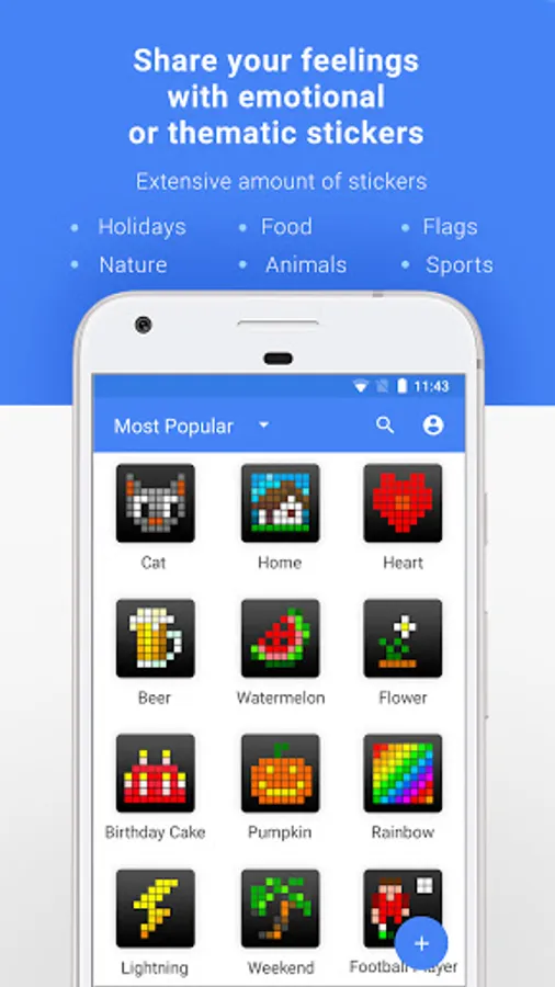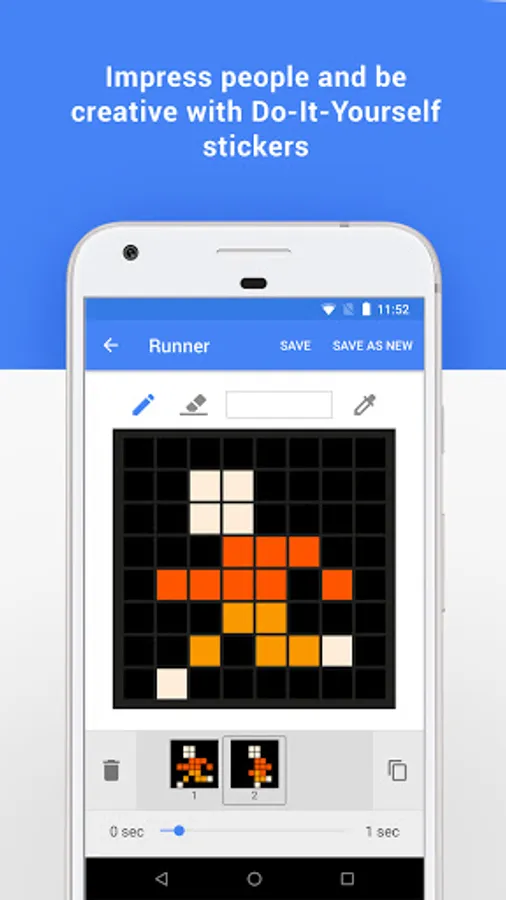 - Show your creativity with 8x8 Do-It-Yourself pixelated stickers or animations and send your masterpiece to friends. Be creative!