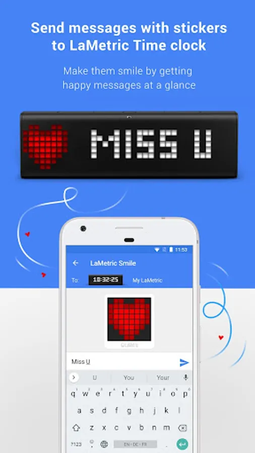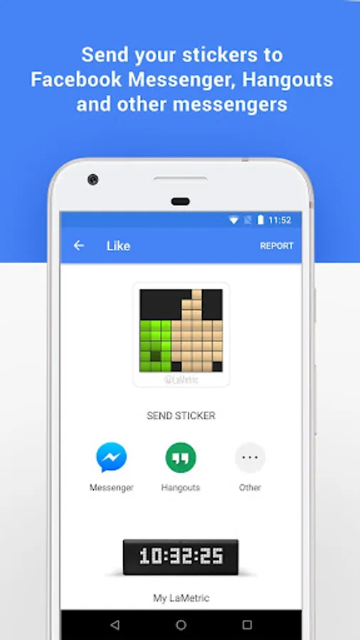 Now everyone can share pixelated emotions in Hangouts and other messengers using the LaMetric Smile app. Share your feelings or mood by choosing among thousands of pixelated stickers or create your own with a built-in creator.