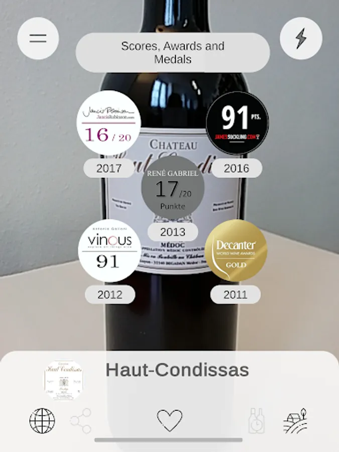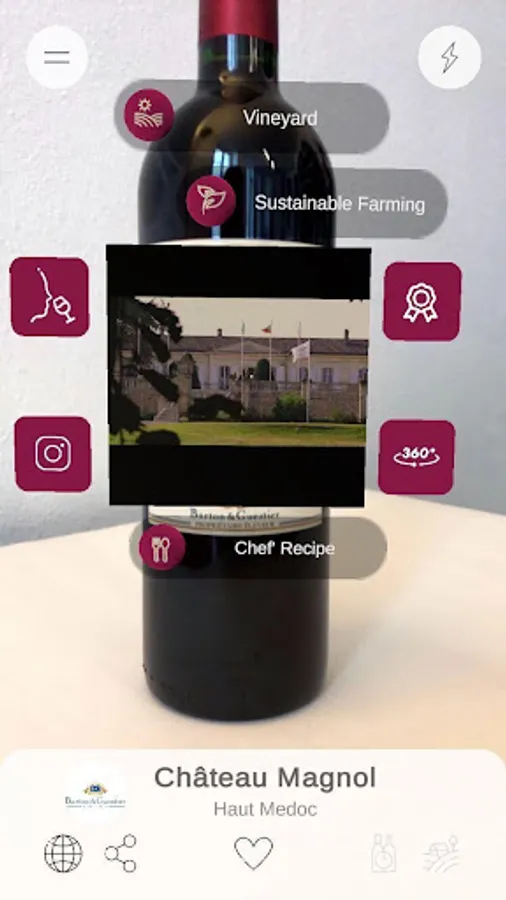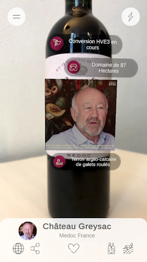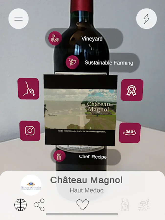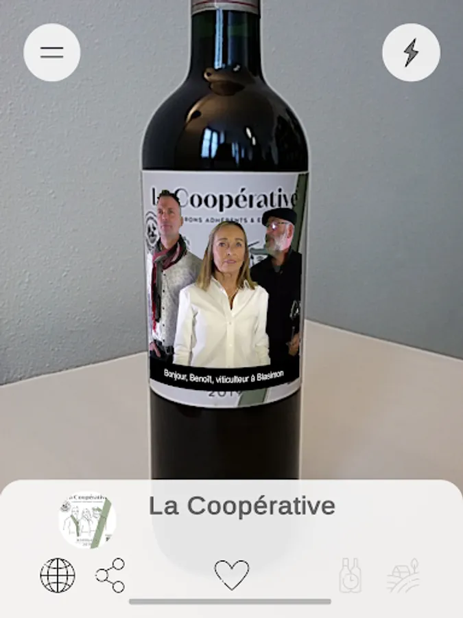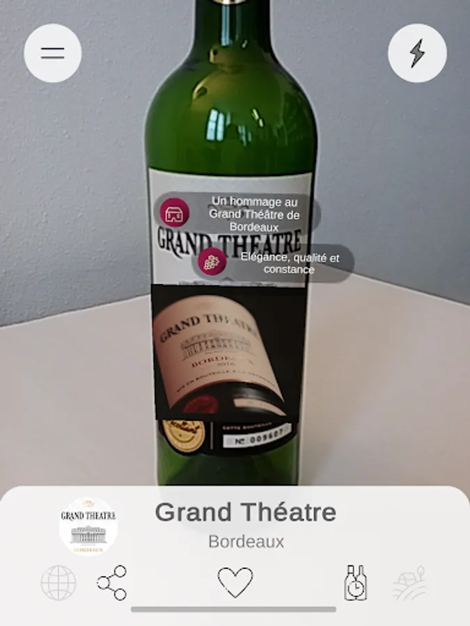 SMARTBOTTLE is the reference application for wine professionals. It is an innovative communication tool for producers which allows customers to discover more about the wine they are interested in, simply by scanning the bottle with the application’s camera. In a simple gesture, information about a wine, an estate or a producer appears on screen thanks to our Augmented Reality technologies.