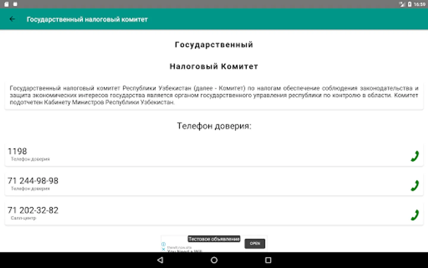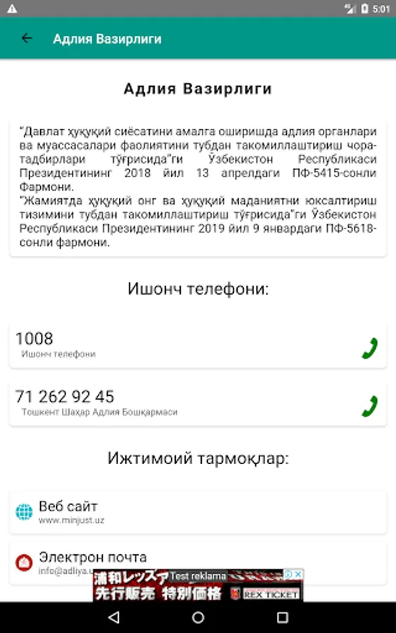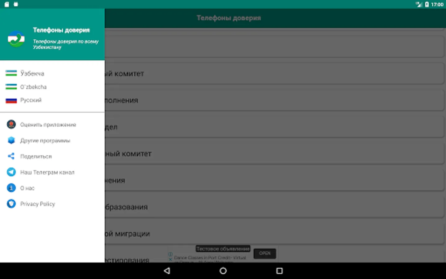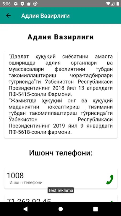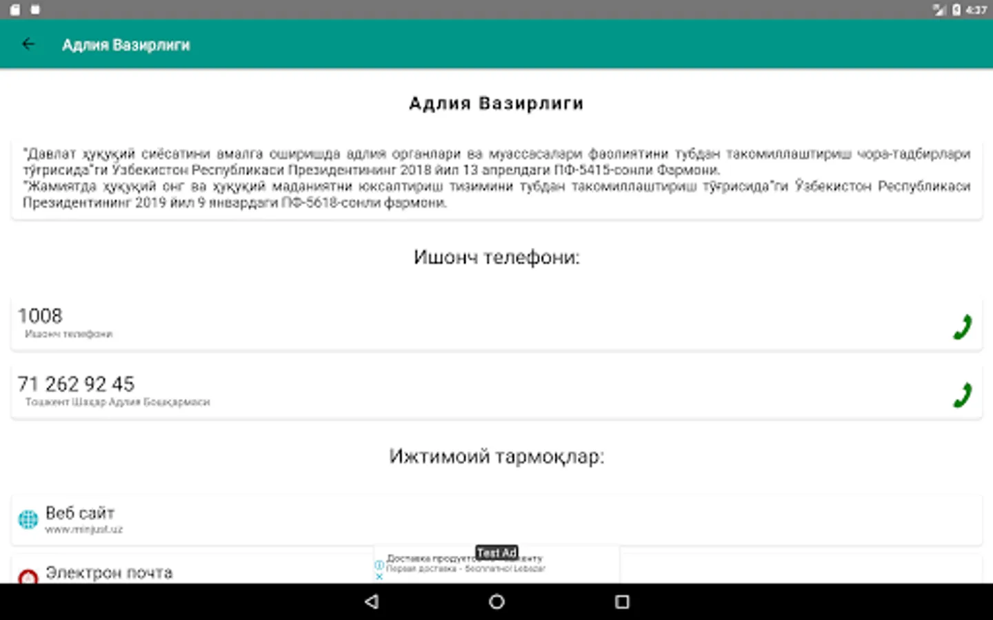Dasturda O'zbekiston bo'yicha ishonch telefonlari keltirilgan.