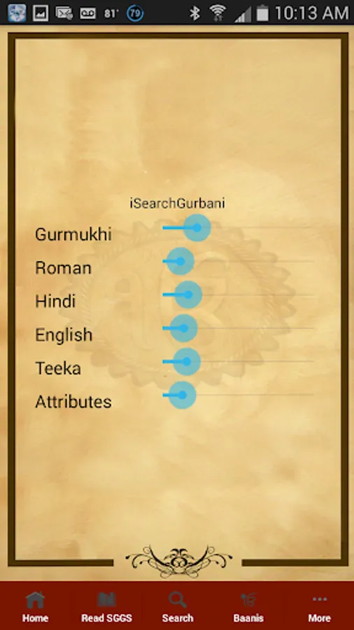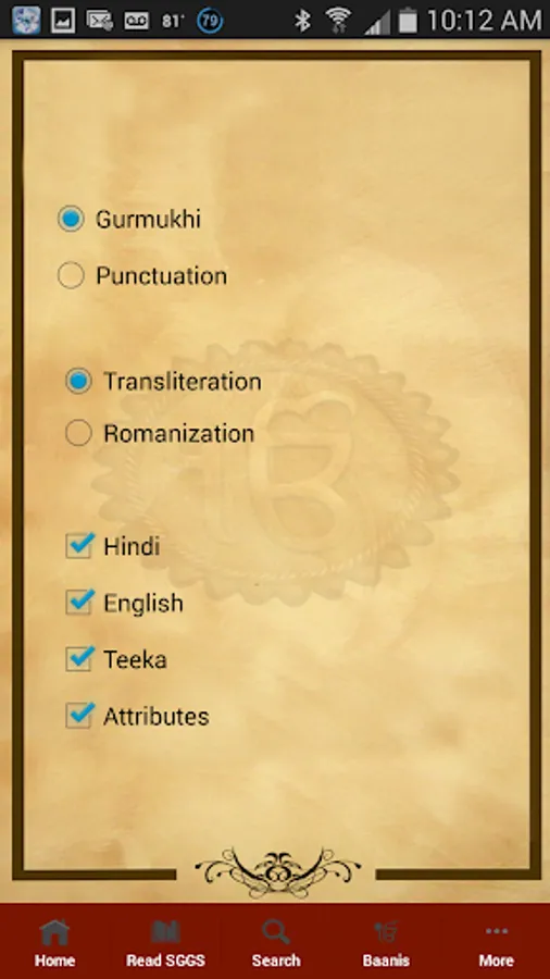 7. Customization for Languages displayed: Gurmukh orGurmukhi Vishraam, Romanisation or Transliteration, Hindi transliteration, English Translation,Teekas (Guru Granth darpan for SGGS), line attributes