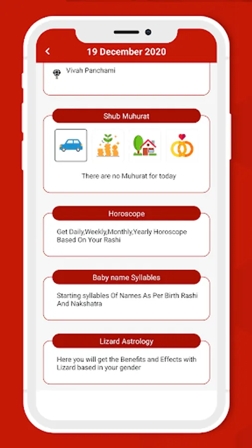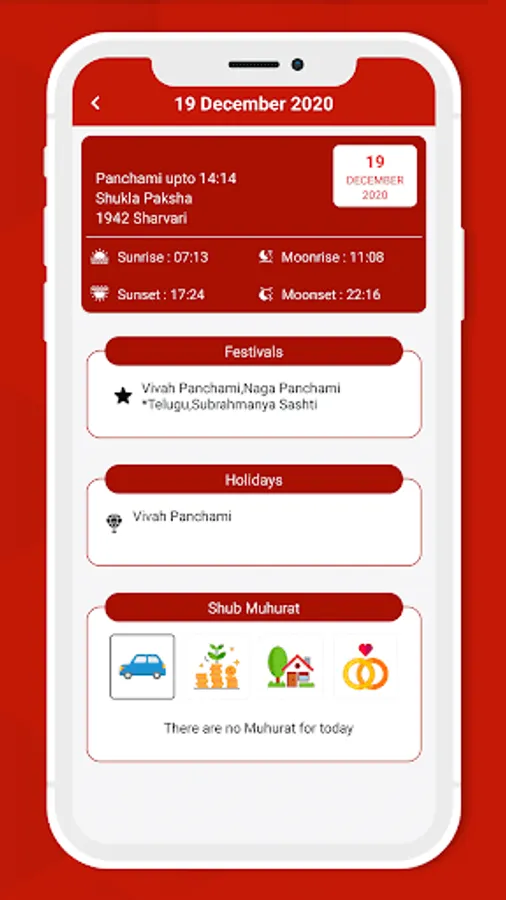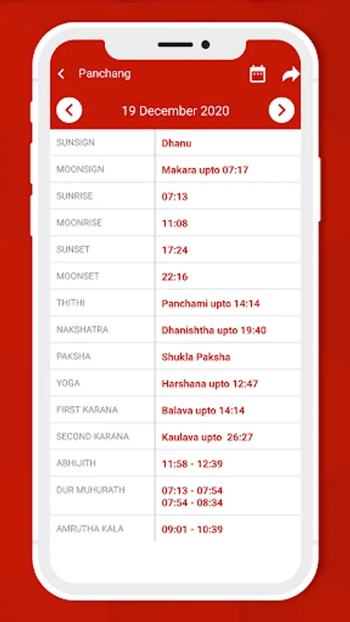 ✔ Daily Panjika: you can find Panchang for any day of the calendar. Tithi, paksha (shukla and krishna), Rashi, Nakshatra, vaar, Yoga and Karana.