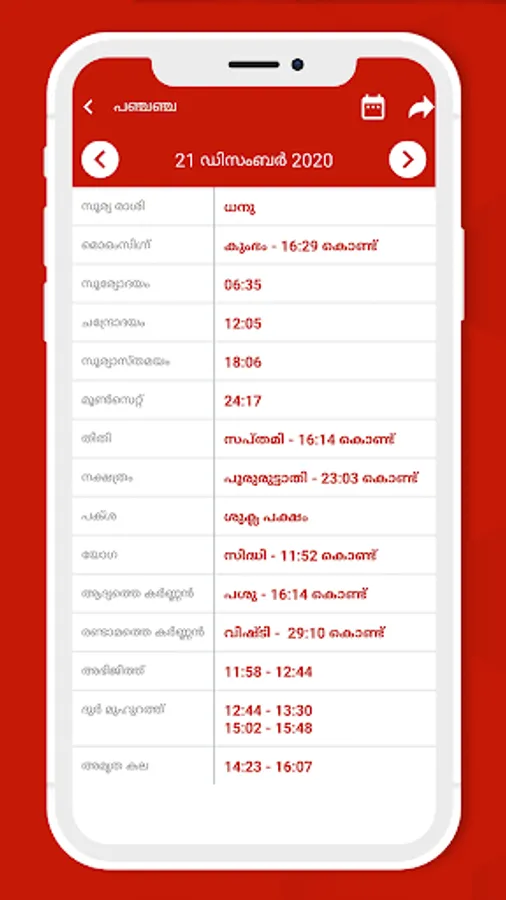 ✔ Malayalam Panjika: you can find Panchang for any day of the calendar. Tithi, paksha (shukla and krishna), Rashi, Nakshatra, vaar, Yoga and Karana.