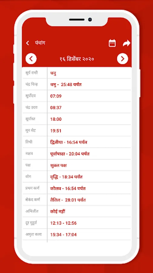 ✔ Marathi Panjika: you can find Panchang for any day of the calendar. Tithi, paksha (shukla and krishna), Rashi, Nakshatra, vaar, Yoga and Karana.