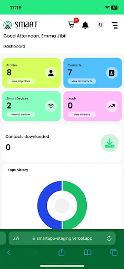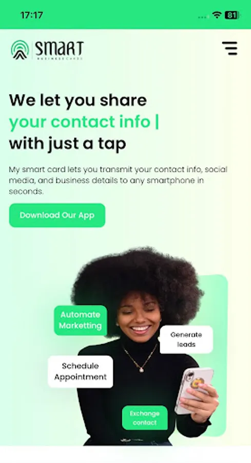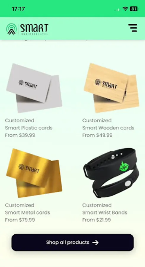 The Smart business card is a digital card with NFC (Near field communication) technology that allows the sharing of information with just a TAP. You can share more than the basic information allowed on a paper business card instantly. No limits to the information you can have uploaded on your smart card and it does not require an APP to function.