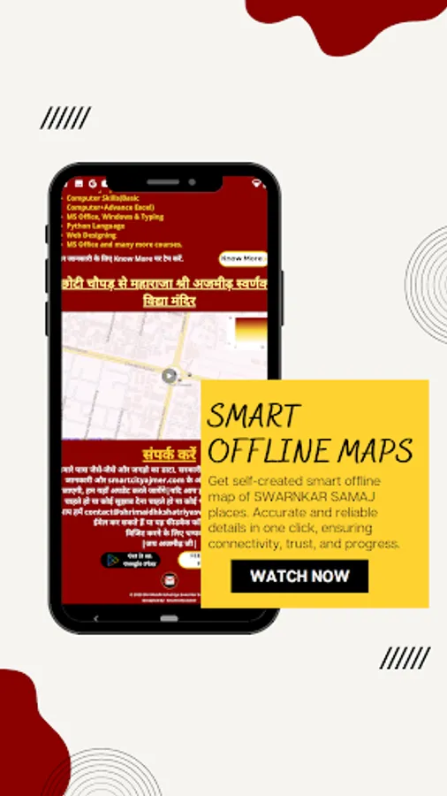 One of the unique features of our web app is the self-created smart offline map, meticulously designed to guide you through the various Swarnkar samaj places. Whether you're looking for temples, community centers, or local businesses, our map ensures seamless navigation, even without an internet connection. Never feel lost or disconnected from your roots with our comprehensive map at your fingertips.