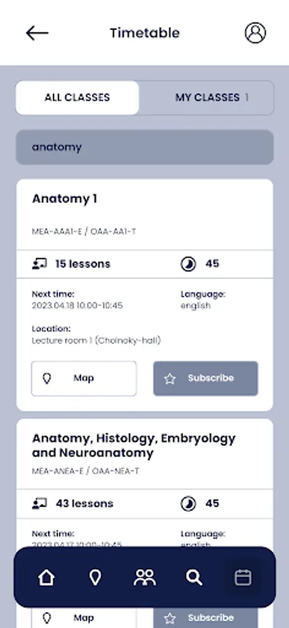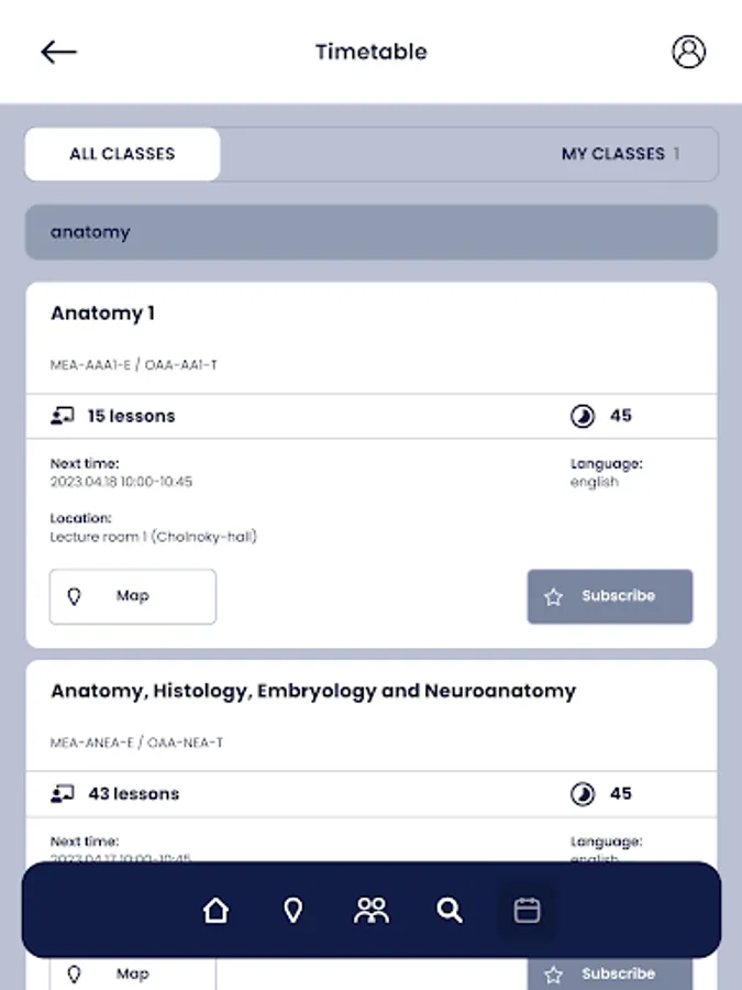 If you don't know where your class will be, just press the map button on the subject's data sheet and the application will show you.