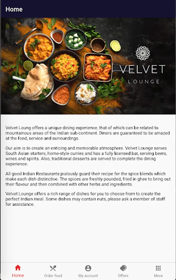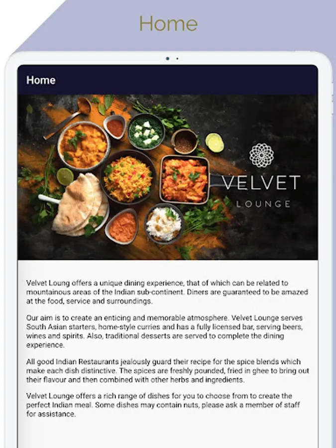 Our aim is to create an enticing and memorable atmosphere. Velvet Lounge serves South Asian starters, home-style curries and has a fully licensed bar, serving beers, wines and spirits. Also, traditional desserts are served to complete the dining experience.