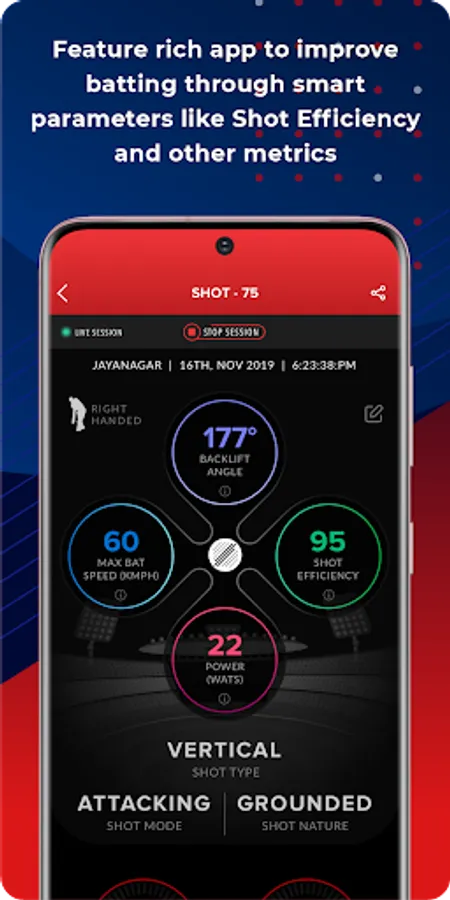 Data captured by our smart cricket batting sensor, BatSense and collected by the SmartCricket app is presented in 11 comprehensive parameters which can assist you in altering, modifying, changing or correcting your game. Parameters like Bat Speed, Bat Angles, Back Lift, Follow-through and Impact Angles etc. will bring a whole new perspective to the game.