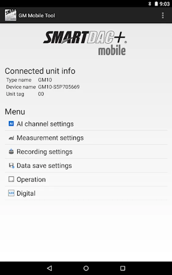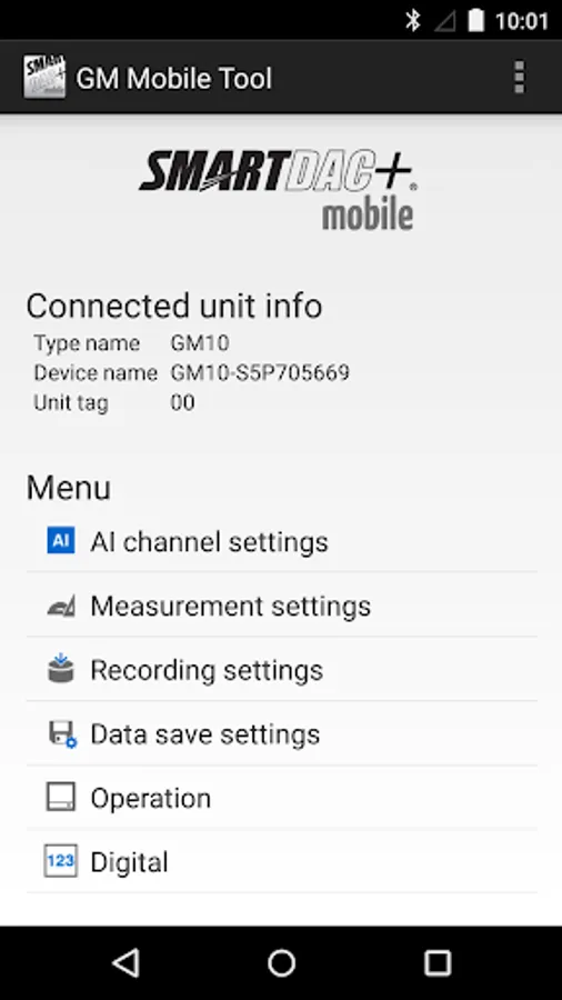 This app allows you to perform GM10 settings, operations, and monitoring from an Android device via Bluetooth wireless.