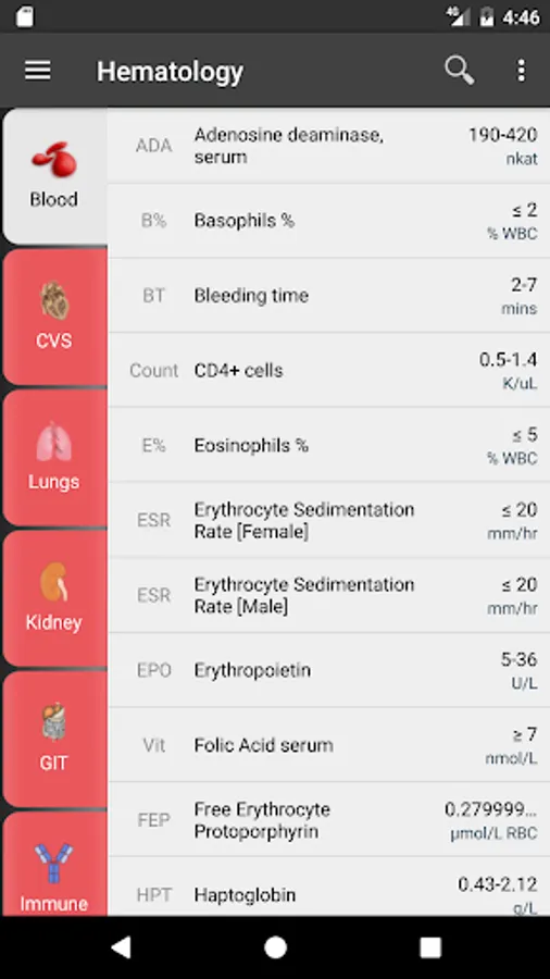• Comprehensive library of medical lab tests with differential diagnosis, related symptoms