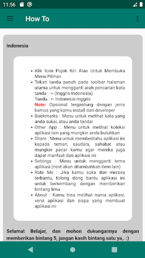 Very Simple Designed, Digital Indonesian-Arabic and Arabic-Indonesian Dictionaries Can Be Easily Operated By Anyone, If Still Having Difficulties, Users Can See The Help Menu To View Instructions For Use.