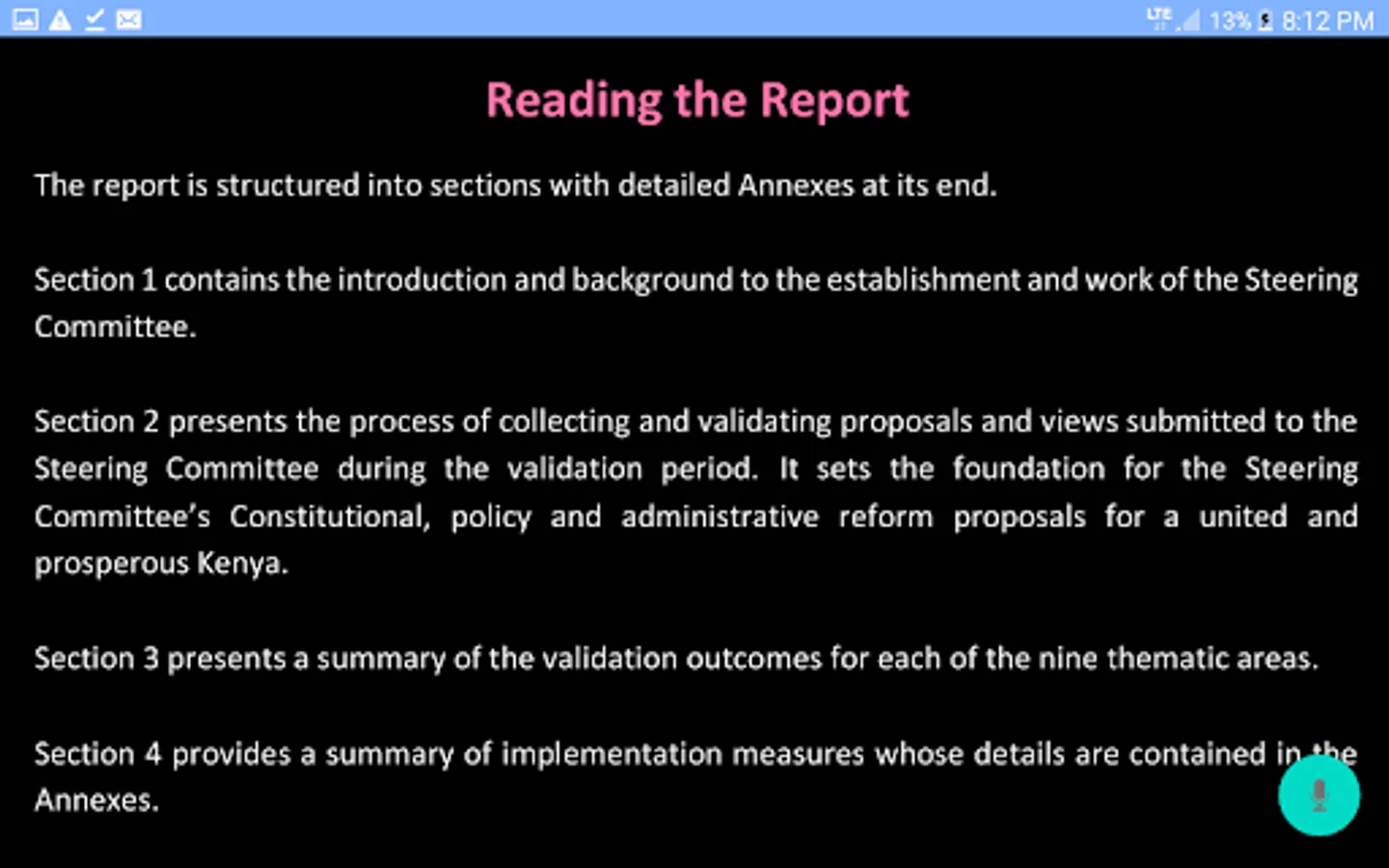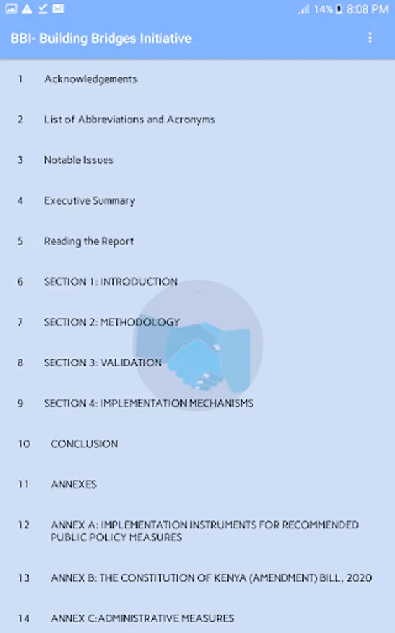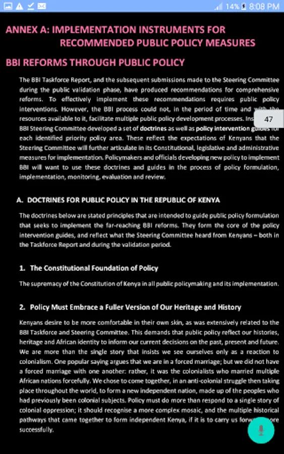 The app allow you to read the official (BBI report Kenya) Building Bridges Initiative final report released on October 2020 and updated on 2th November 2020. You can listen as well as read.