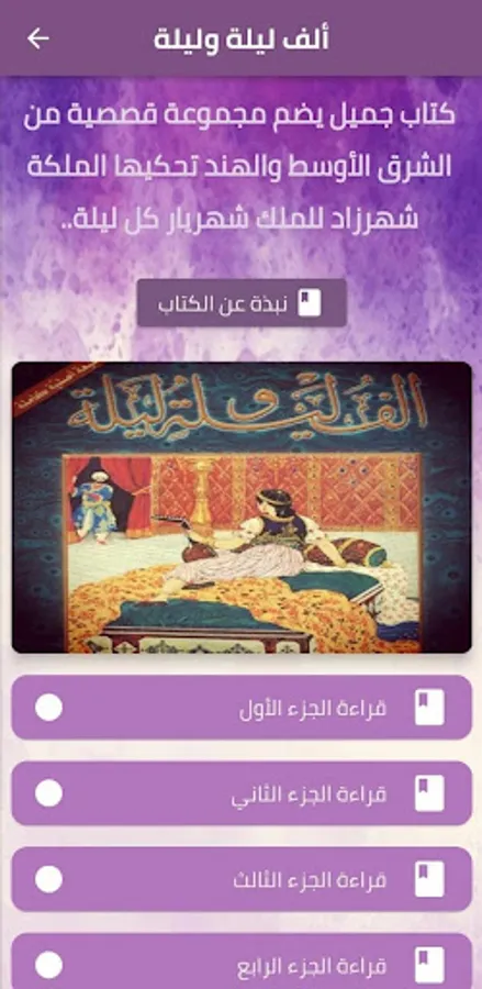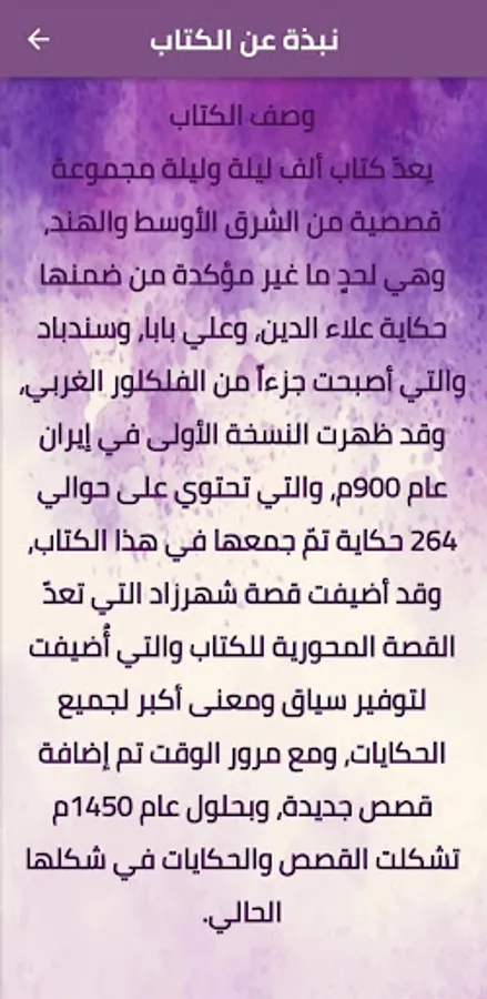 The One Thousand and One Nights Books pdf application offers you the most wonderful collection of stories throughout history from the novels and literary stories of Abdullah bin Al Muqaffa, which are stories told by Queen Scheherazade to King Shahryar..