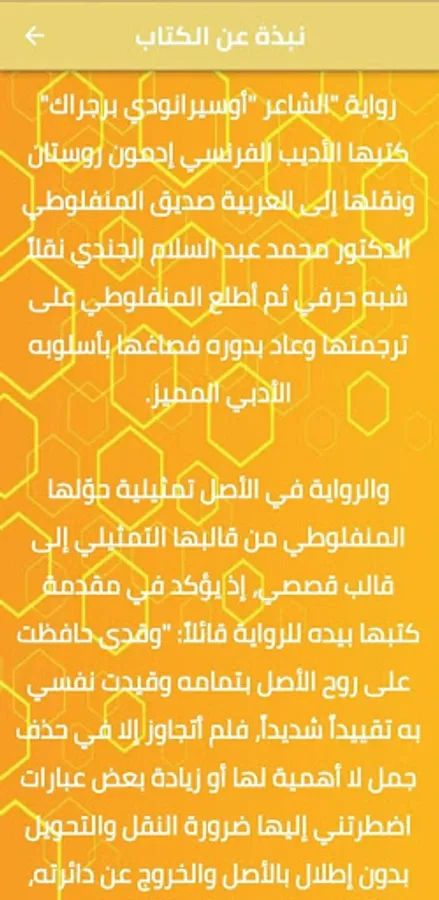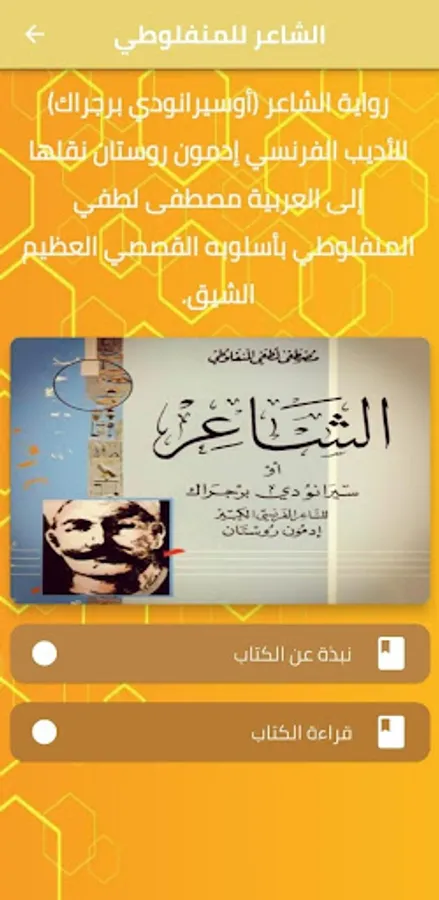 The application of the poet's novel by Al-Manfaluti pdf presents to you the poet's novel, which is originally titled "Cyrano de Bergerac" about a character with the same name by the French writer Edmond Rostan, and it was formulated in Arabic by the writer Mustafa Lutfi Al-Manfaluti..