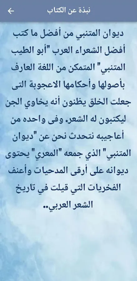 The Diwan Al-Mutanabbi pdf application contains a glimpse of the book, and you can read the book with the letters enlarged and reduced in order to suit your eyes and vision.