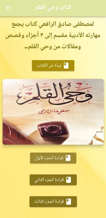 The application of the book Wahy al-Qalam by al-Rafi pdf contains a glimpse of the book, and you can read the book in its three parts, with the letters enlarged and reduced in order to suit your eyes and vision.