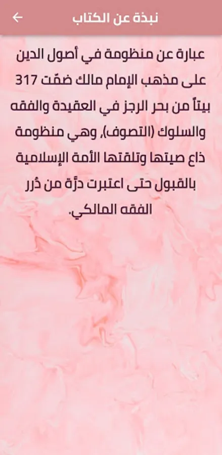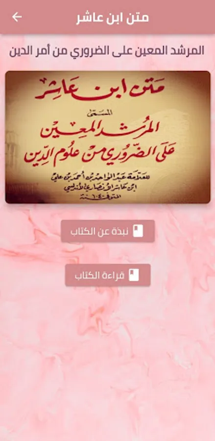 The application of the book Matn Ibn Asher by Al-Maliki pdf, called the guide assigned to the necessary sciences of religion, contains an overview of the book and you can read the book with the letters increasing and decreasing in order to suit your eyes and vision.