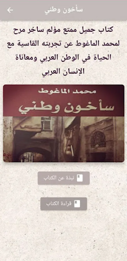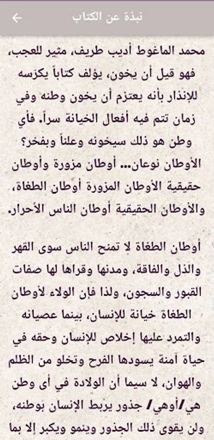 The application I will betray my homeland for Maghout pdf presents to you an important, interesting, satirical, but painful and enjoyable book at the same time, from the creativity of the writer Muhammad al-Maghut, in which he tells about the suffering of the Arab person in his homeland due to the absence of freedom...