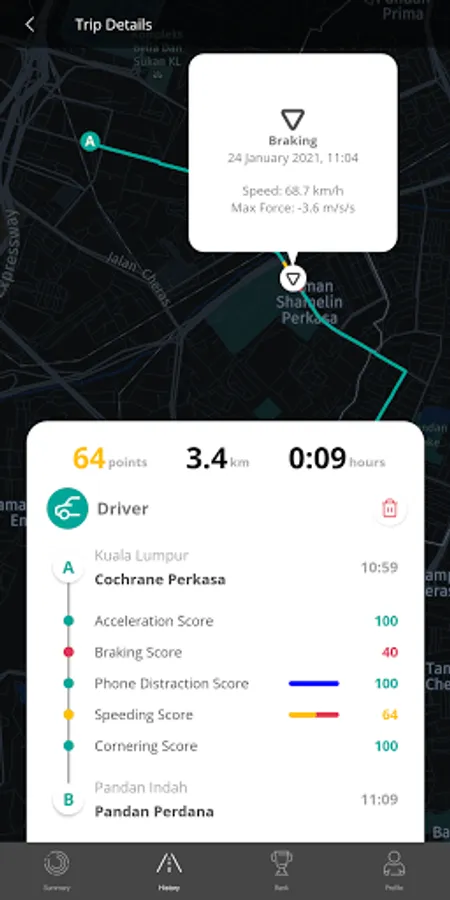 Review your trips in detail. Find out where & when the hard acceleration or braking happened and you can use that information to improve your driving or riding style.