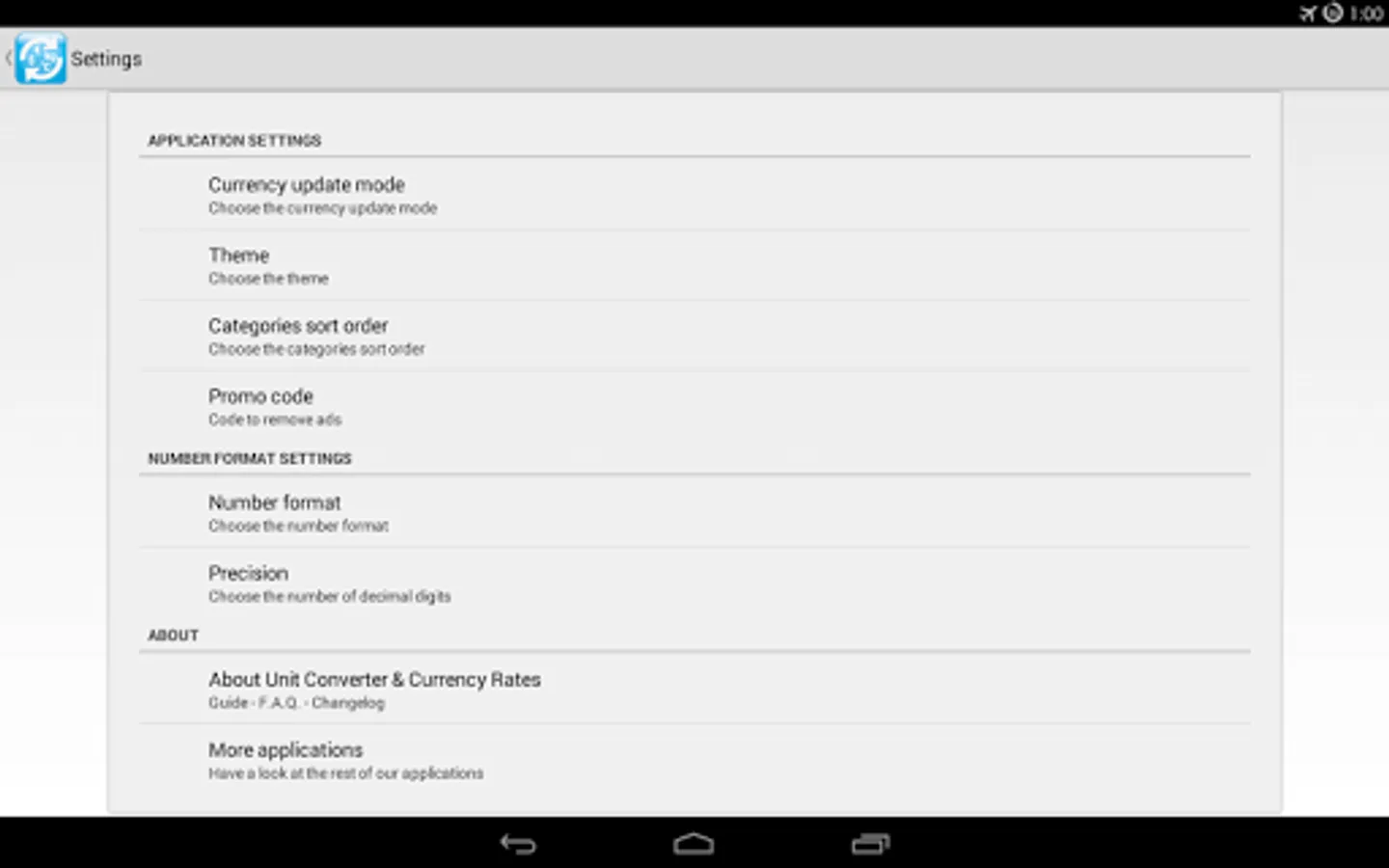 Unit Converter & Currency Rate includes many units and if you want us to add more, feel free to email us! The output format can be easily adjusted according to your needs (scientific format, decimal places).