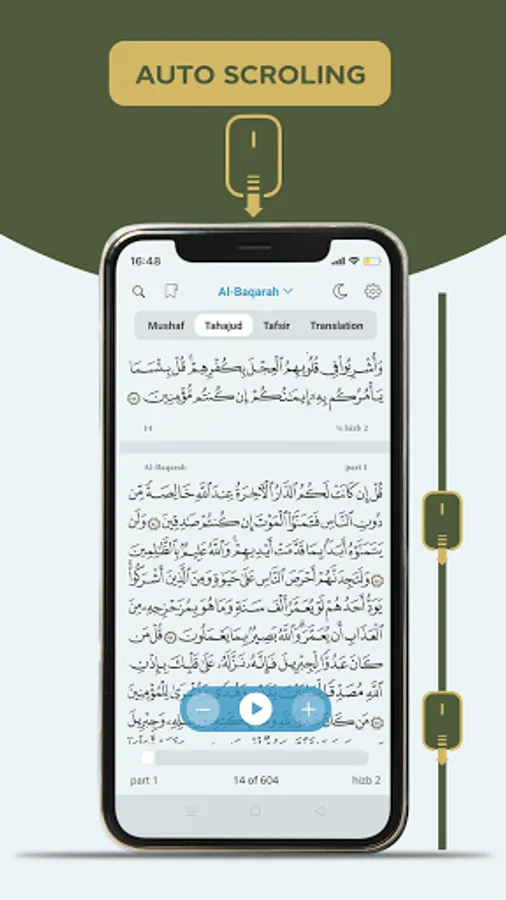 The Holy Quran app with automatic page scrolling feature to assist in reading Quran especially while performing prayers.