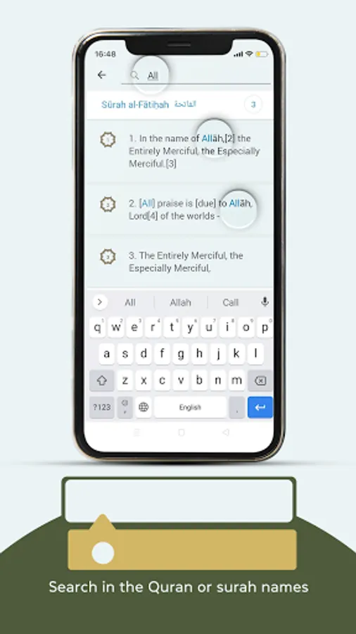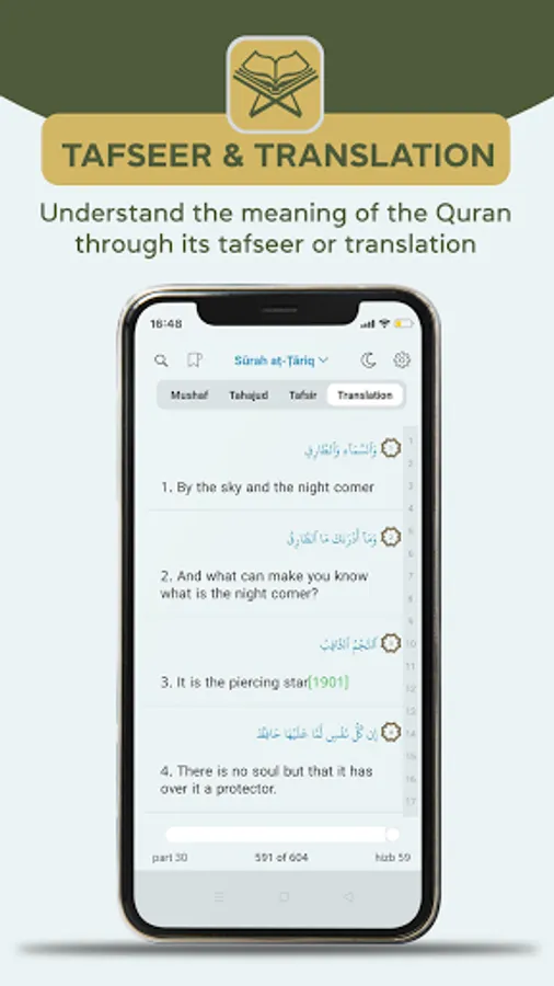 • The application provides interpretation of Ibn Kathir, and the English translation of Sahih International.