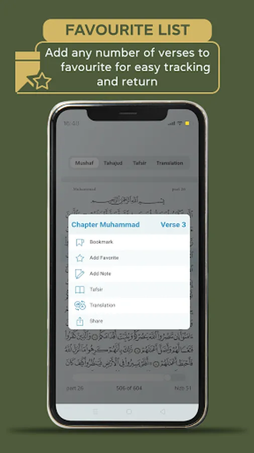 • Sharing: The user can share the text of a verse or a group of verses, either as text with diacritics or without it, or as an image. Translation and interpretation also can be shared together with the verses.