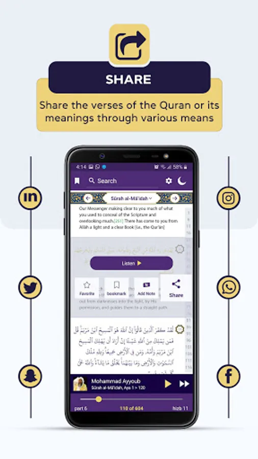 - Ability to bookmark any verse, add any number of verses to your favorites, and write your thoughts while reciting the Qurān or reading the translation of its meanings.
