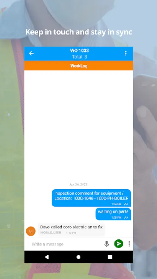 − Have a chat of worklog and capture notes and send messages with voice-to-text functionality