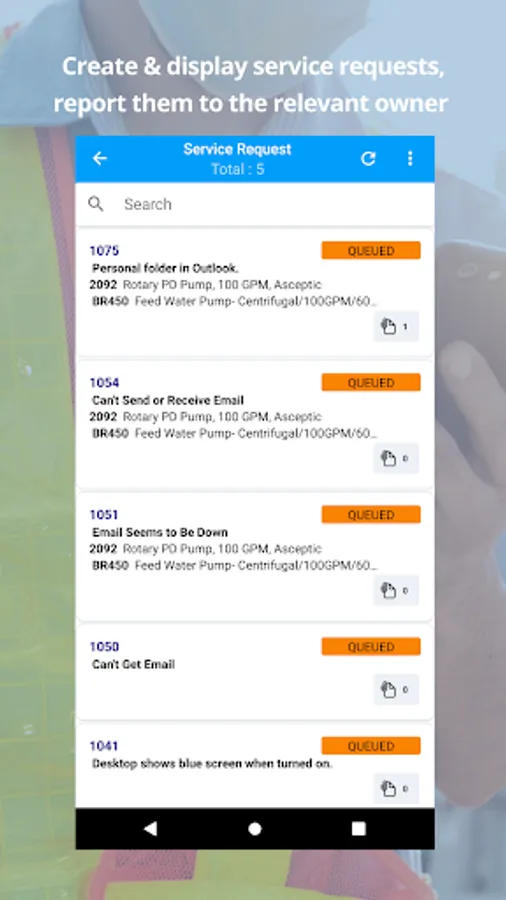 − Create service requests, report them directly to the relevant owner, or log them into a preventive or corrective service plan
