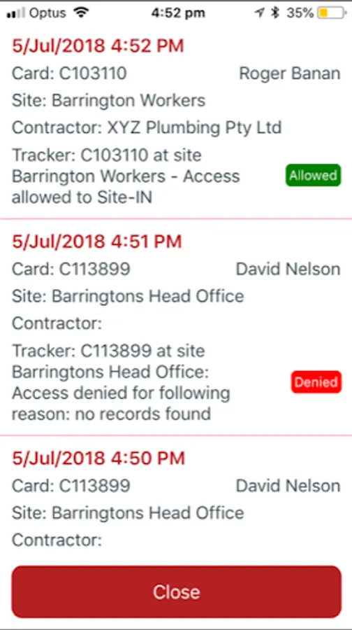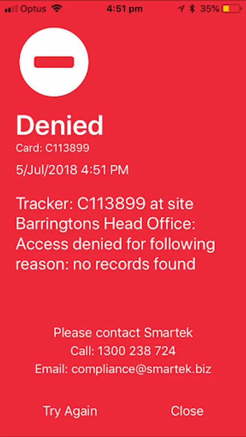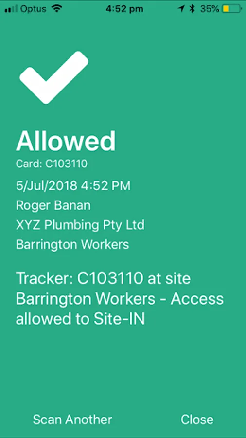 In the action of scanning the employee card, the access to the site will be analysed by Smartek to determine if the employee being scanned is ALLOWED into the site, or DENIED.